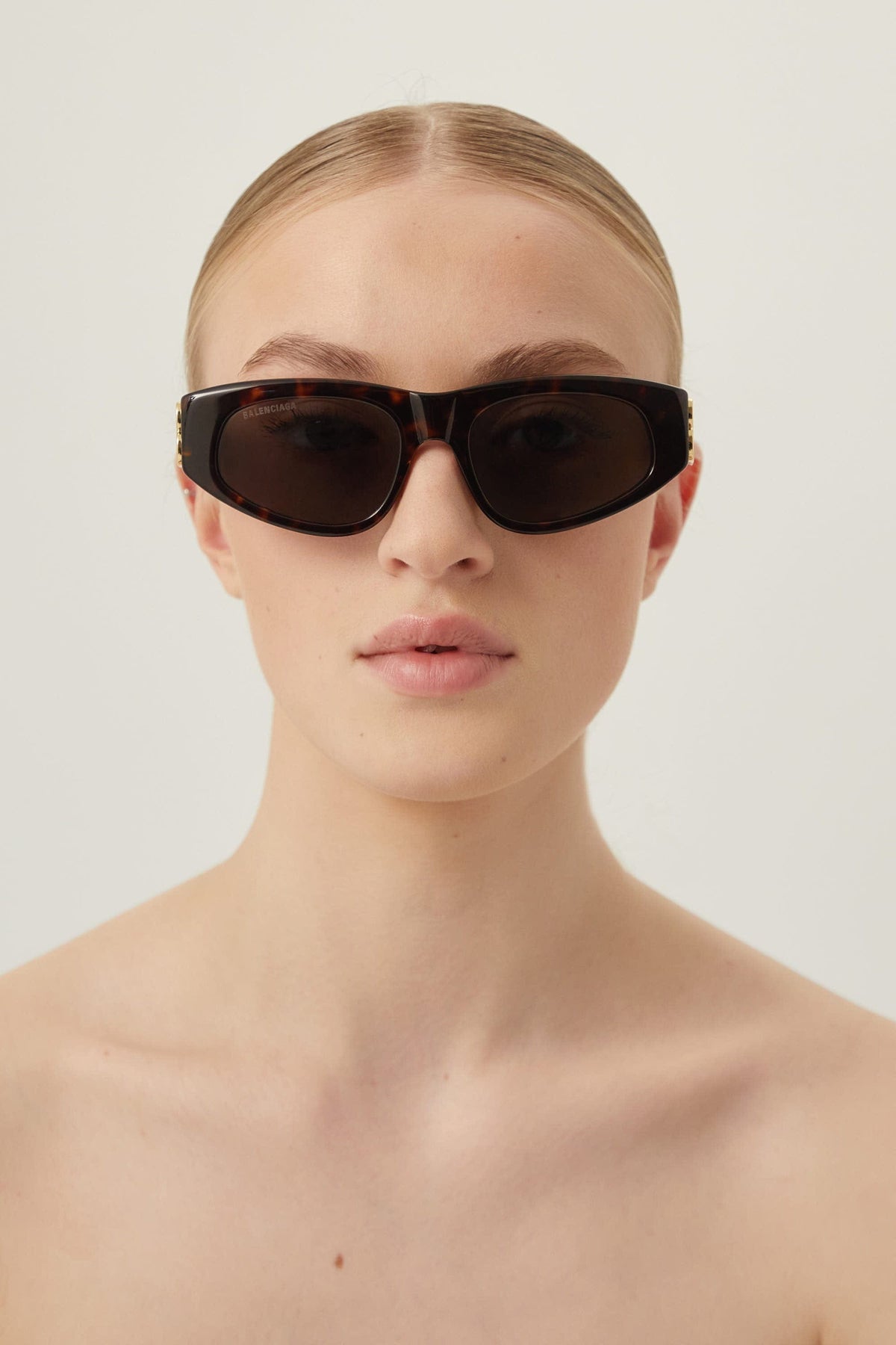 Balenciaga logo lasered on right lens.